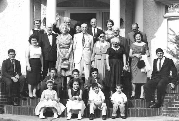 Large gathering at Larchmont (home of Uncle Steve and Aunt Shushon). (rear) Aunt Lillian, my parents, unknown couple, Uncle Katch (middle) John, Aunt Armine, Uncle Steve & Shushon, grandparents, Nevart, Uncle Doc, Aunt Lillian, Gary (seated rear) unknown, Armen, myself (seated front) Margaret, Donna, Dicron, Steven