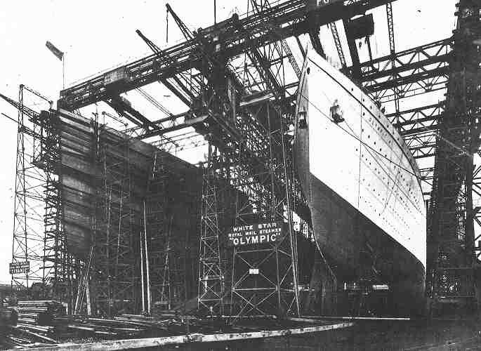 Titanic (left) and Olympic together. This photo was taken the day Olympic was launched (October 20, 1910). "The skeleton within the scaffolding began to shape, at the site of which men held their breaths. It was the shape of a ship, a ship so monstrous and unthinkable that it towered there over the buildings and dwarfed the very mountains by the water...with a rudder as big as a giant elm tree, with propellers the size of windmills - everything was on a nightmare scale..." - Belfast resident; 1910 |