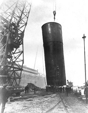 Funnel being installed on Olympic. The forward three funnels were functional, providing exhaust for the 29 boilers below. The fourth funnel was a dummy, serving as a ventilation shaft for the engine room, which was extremely hot and smoky from the boilers and the engines themselves. |