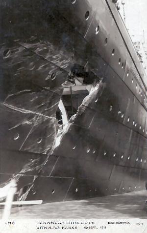On September 20, 1911, Olympic left Southampton on her fifth crossing. She steamed along the Spithead Channel, between the mainland and the Isle of Wight, on her way to the English Channel. She was still technically under control of the pilot when the Royal Navy cruiser, HMS Hawke rammed into her starboard side. Accounts of the incident vary, some witnesses said that the Captain of the warship, George William Bowyer, was showing off and recklessly maneuvering his vessel; others claimed that Olympic's propellers sucked the cruiser towards her. HMS Hawke punched a large triangular hole in the liner's hull and almost capsized before she could pull free. Olympic's starboard and central engines were damaged and inoperable. The badly crumpled bow of the Hawke left her barely able to navigate. Both ships slowly made their way to the nearest port. |