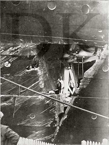 Hole left in the Olympic by Royal Navy cruiser HMS Hawke.